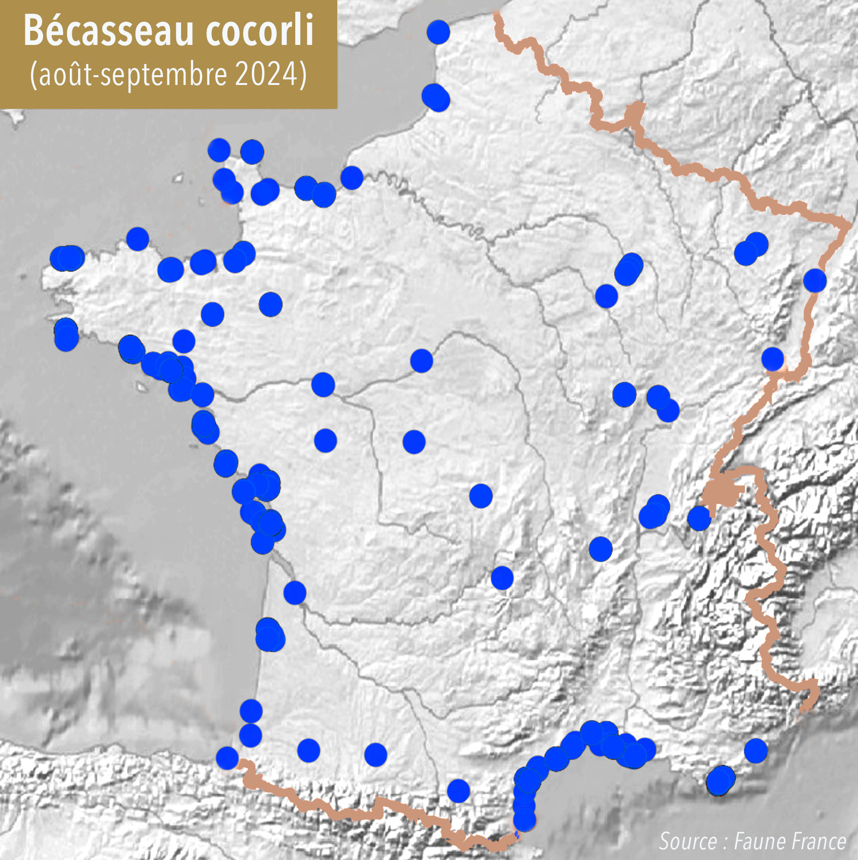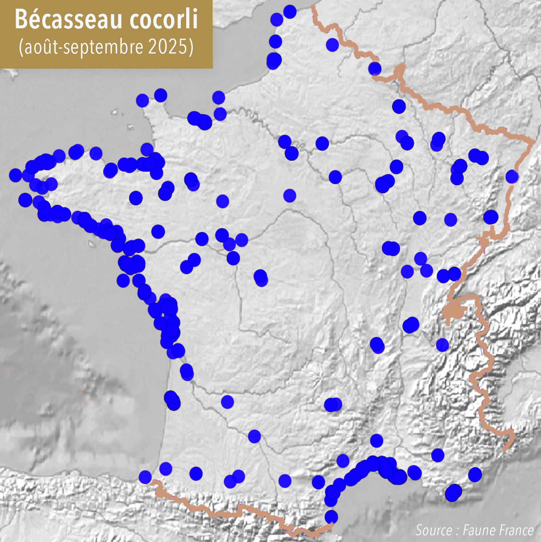 À noter également un passage postnuptial inhabituel en termes d’effectifs du Bécasseau cocorli, notamment sur les côtes atlantiques. Comme le montrent les cartes ci-dessous, le nombre de données en France est nettement plus élevé cette année (fig. 2) qu’au cours de la même période en 2024 (fig. 1), en particulier en Bretagne. Ce phénomène a également été observé dans les îles Britanniques début septembre, où le passage est considéré comme le plus important depuis de nombreuses années, avec des effectifs estimés à plusieurs milliers d’oiseaux. Bien que l’espèce soit en fort déclin (-30 à -49 % au cours des 15 dernières années) à l’échelle mondiale, elle bénéficie, à l’instar des autres limicoles nichant dans la toundra, de l’effet « années à lemmings », au cours desquelles les Renards polaires et les Labbes à longue queue se nourrissent essentiellement de petits rongeurs, alors qu’ils capturent de nombreux poussins de limicoles les années pauvres en lemmings. Il est donc probable que l’espèce ait connu une saison de reproduction productive dans l’Arctique cet été, ce qui se traduit par un grand nombre de juvéniles en migration cet automne. Cela tient sans doute aussi aux vents de sud-est ayant soufflé début septembre, poussant les oiseaux plus au nord-ouest que d’habitude alors qu’ils se dirigeaient vers leurs quartiers d’hiver africains.